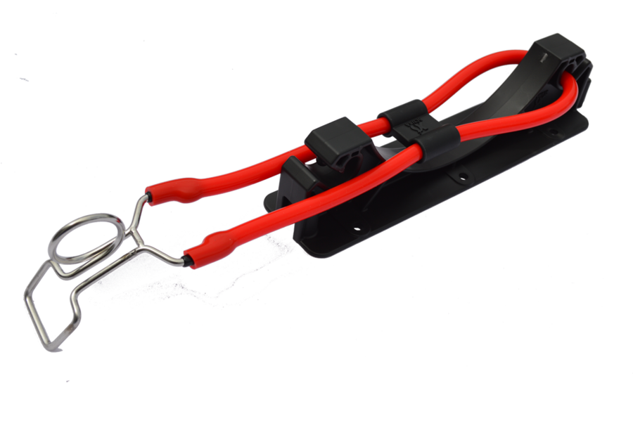 XS Scuba Flaschenhalter, kann mit weiteren Einheiten verbunden werden, das Gummiband lässt sich auf beiden Seiten ein-/aushängen..