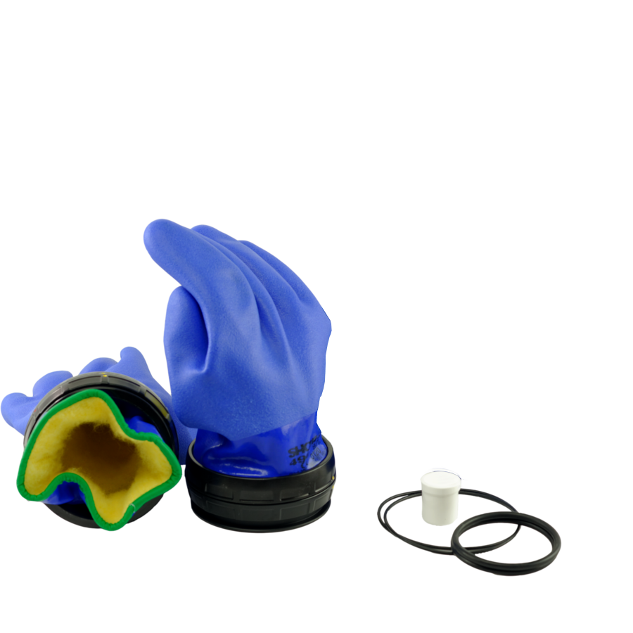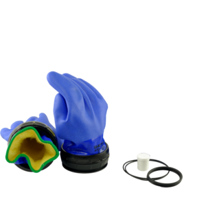 Komplettes, vormontiertes Set mit blauen Handschuhen mit festem Innenfutter mit O-Ringen und Silikonpflegemittel